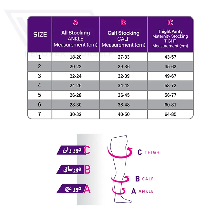 سایز/ اندازه | A (دور مچ) | B (دور ساق) | C (دور ران) |